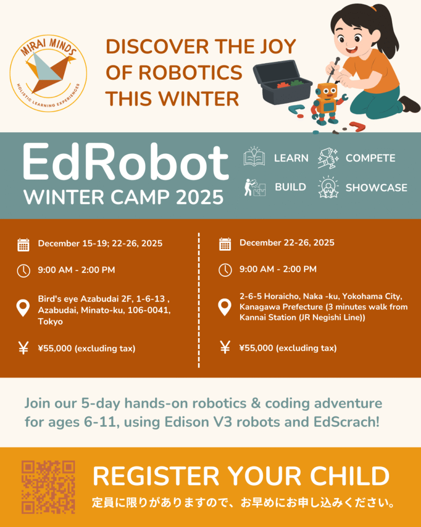 This winter, give your child an unforgettable learning experience at Mirai Mind’s EdRobot Winter Camp in Tokyo 2025! Designed for children aged 6–11 (Grades 1–5), our 5-day robotics and coding camps in Yokohama and Azabudai also combine creativity, hands-on learning, and teamwork in a fun, English-based environment.